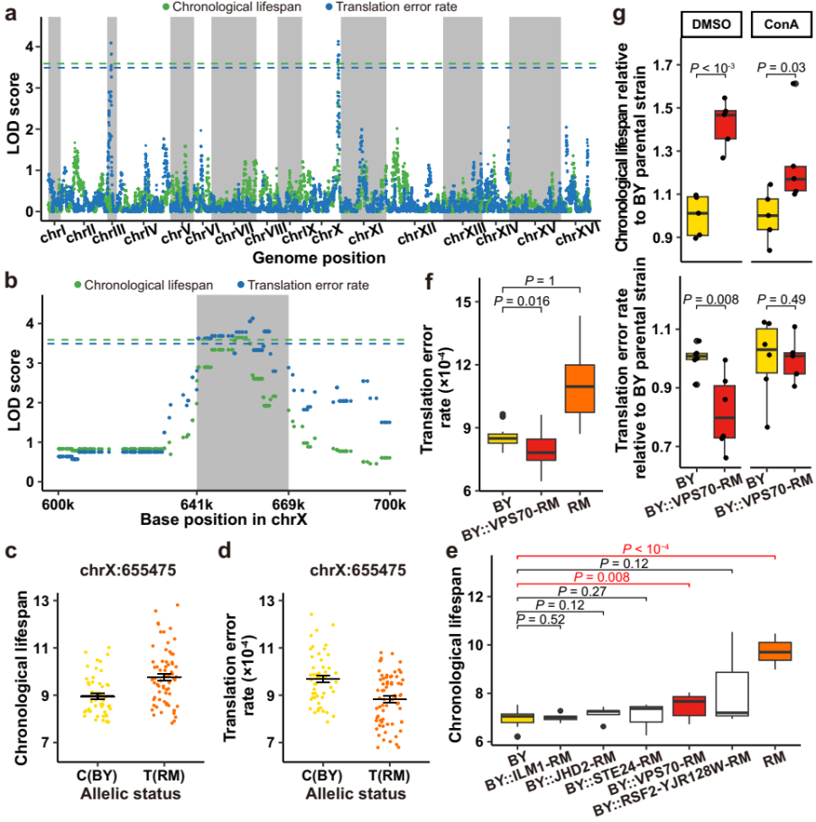 对长寿菌株的QTL分析显示,酵母10号染色体的VPS70基因位点与翻译保真度和寿命显著相关(图3a-d)。将BY菌株的VPS70替换为RM菌株的等位基因后,翻译错误率降低约8.0%,寿命延长约8.9%(图3e/f)。后续的机制探究实验表明,VPS70降低错误率和延长寿命的功能都依赖液泡(对应哺乳动物细胞的溶酶体)(图3g)。