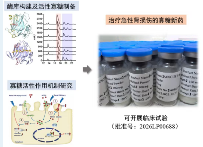 近日,中山成人直播 王蔚东、李春凌教授课题组在海洋活性寡糖转化应用领域取得重要进展。团队联合国内高校与产业界历经十余年攻关,共同研发的“治疗急性肾损伤的海洋寡糖”创新药正式获国家药品监督管理局临床试验批准(批准号:2026LP00688),标志着该成果从基础研究迈向临床转化关键阶段,成为课题组近年产学研用协同创新的标志性成果。