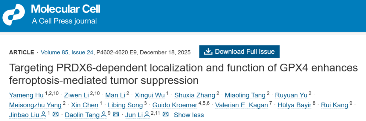 2025年12月18日,成人直播 李隽教授、广州医科大学刘金保教授与美国德克萨斯大学唐道林教授团队合作,在Molecular Cell上发表了题为Targeting PRDX6-dependent localization and function of GPX4 enhances ferroptosis-mediated tumor suppression的研究成果。该研究系统揭示了过氧化还原酶6(PRDX6)介导的铁死亡防御机制,阐明了其结合并携带GPX4蛋白上膜促进细胞膜磷脂过氧化损伤修复,进而诱导肿瘤细胞铁死亡逃逸的作用机制,为靶向癌症治疗提供了新思路。