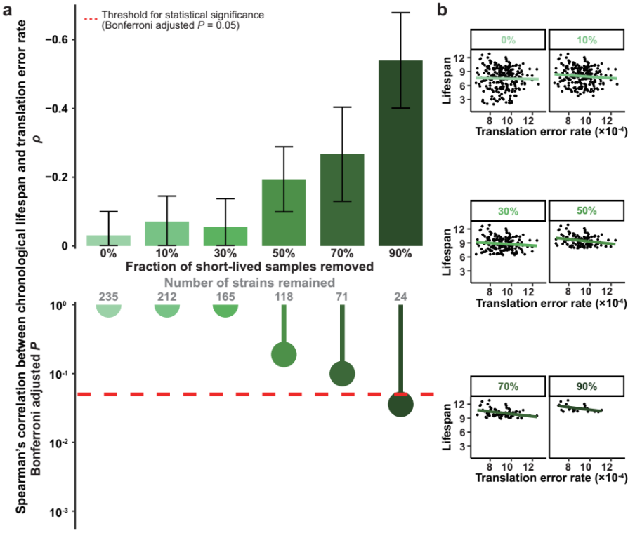 团队使用酿酒酵母BYxRM杂交的235个单倍体菌株,高通量测定其寿命与翻译错误率。结果显示,同时分析所有菌株时,寿命与翻译错误率没有显著相关。但随着短寿菌株的移除,负相关性逐渐增强,并在余下10%长寿菌株时达到显著水平(图2)。该结果与理论模型一致,证明了在长寿个体中翻译保真度与寿命的关联。