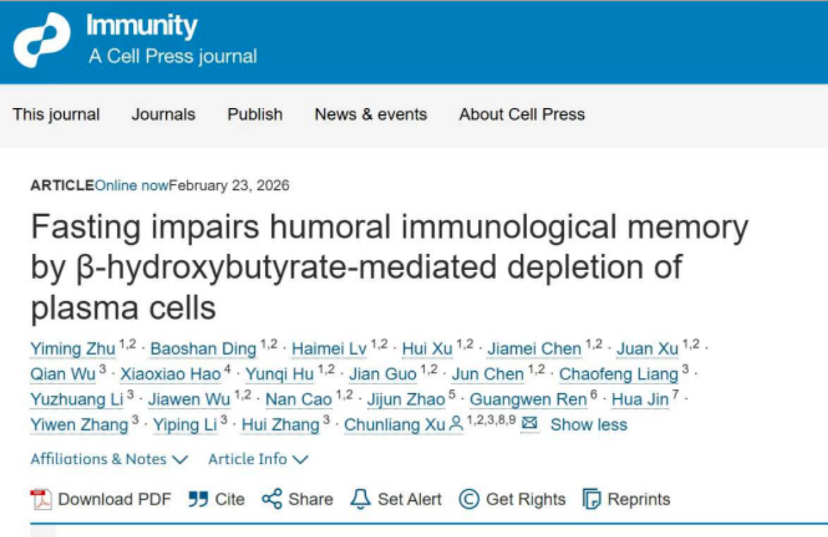 Immunity | 我院徐春亮教授团队揭示禁食损害体液免疫记忆,削弱疫苗保护效果