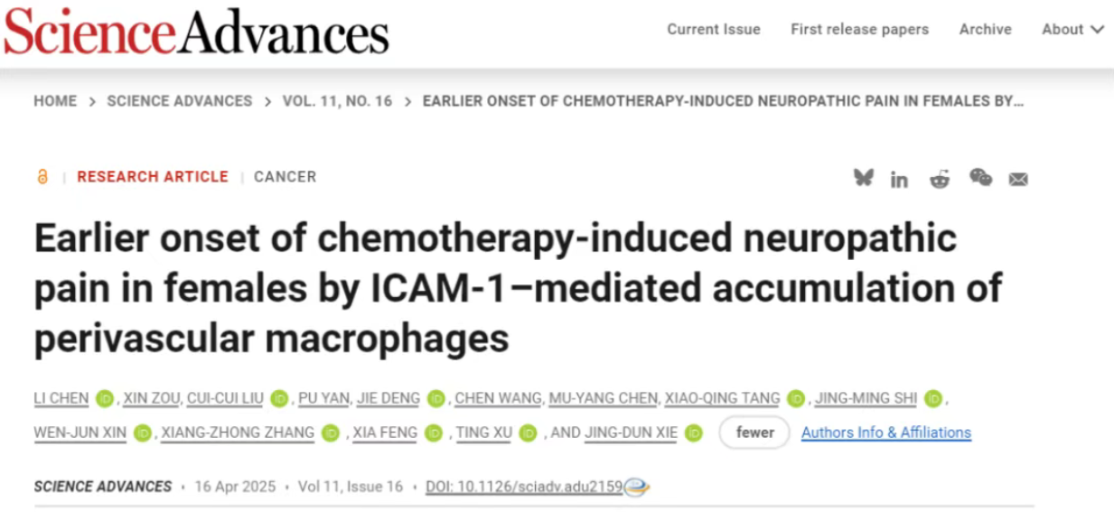 2025年4月16日,成人直播 信文君教授和徐婷副教授团队与成人直播 肿瘤防治中心谢敬敦教授、成人直播 附属第一医院冯霞教授和成人直播 附属第三医院张祥忠教授合作,在Science Advances期刊上发表了题为“Earlier onset of chemotherapy-induced neuropathic pain in females by ICAM-1–mediated accumulation of perivascular macrophages”的研究论文。该研究从化疗诱导的神经病理性疼痛(chemotherapy-induced neuropathic pain, CINP)入手,以硼替佐米(Bortezomib, BTZ)为例,揭示了BTZ诱导的神经病理性疼痛存在性别差异,提出了ICAM-1介导的性别特异性免疫通路驱动“血管周围巨噬细胞–星形胶质细胞–神经元”信号轴激活,从而诱发女性个体中BTZ相关神经病理性疼痛的理论框架。