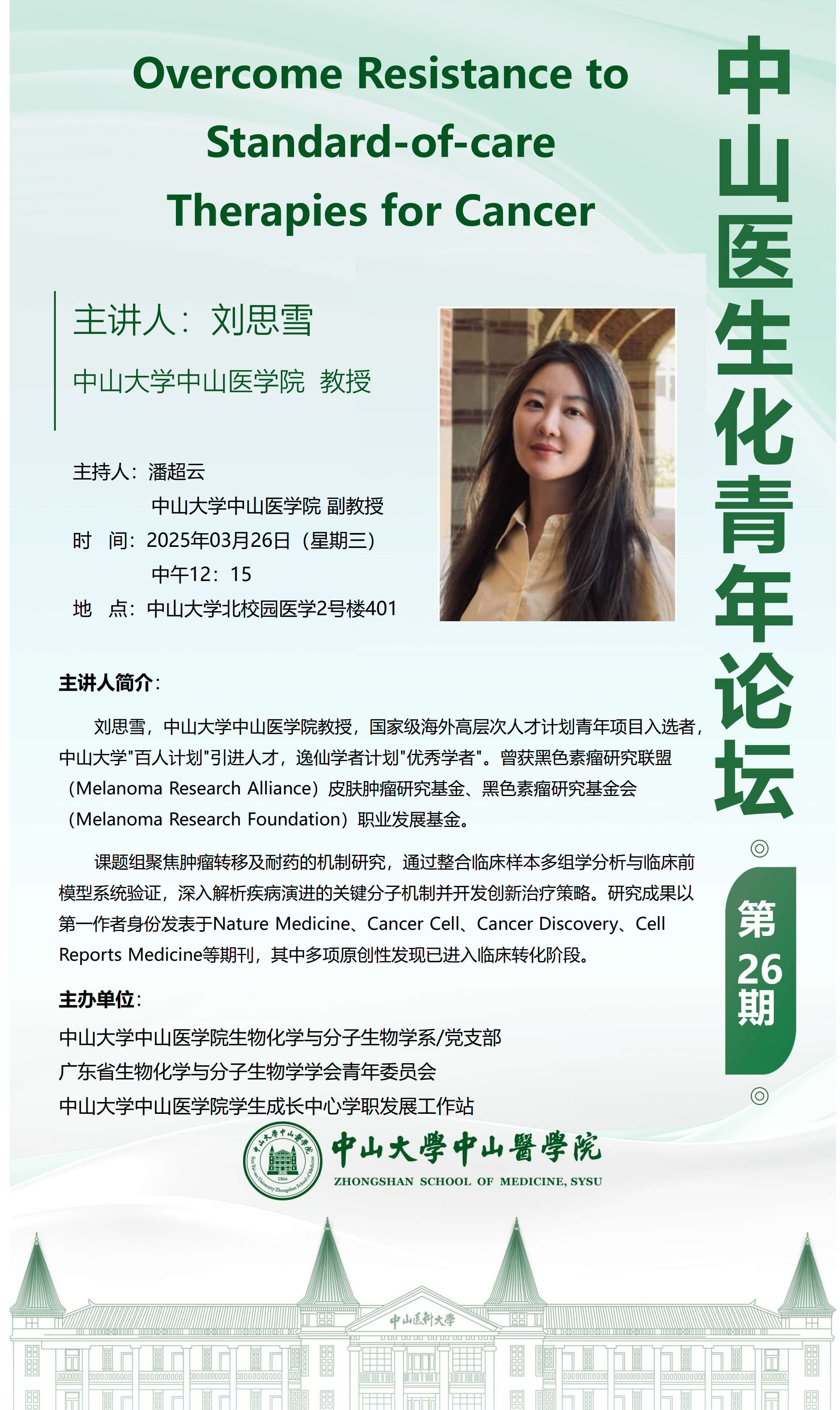导航痕迹 成人直播 科学研究 学术讲座 中山医生化青年论坛第26期 科学研究 科研通知 学术讲座 科研平台 办理指引 中山医生化青年论坛第26期 Overcome Resistance to Standard-of-care Therapies for Cancer 发布人:张玉琦 发布日期:2025-03-18