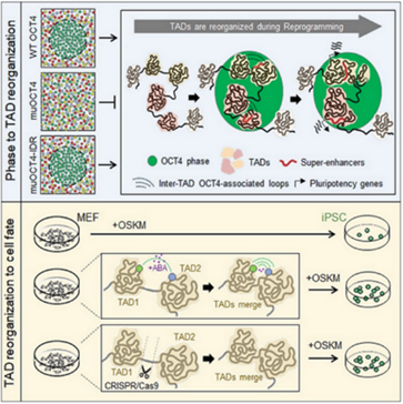 2021年5月25日,来自成人直播 的丁俊军实验室在Cell Stem Cell上发表了题为 Phase separation of OCT4 controls TAD reorganization to promote cell fate transitions 的文章,首次阐明了关键转录因子OCT4通过相分离(phase separation)机制调控TAD重组以推动体细胞重编程的进行。该研究是第一篇阐述相分离机制调控染色质高级结构以推动细胞命运转变的文章。